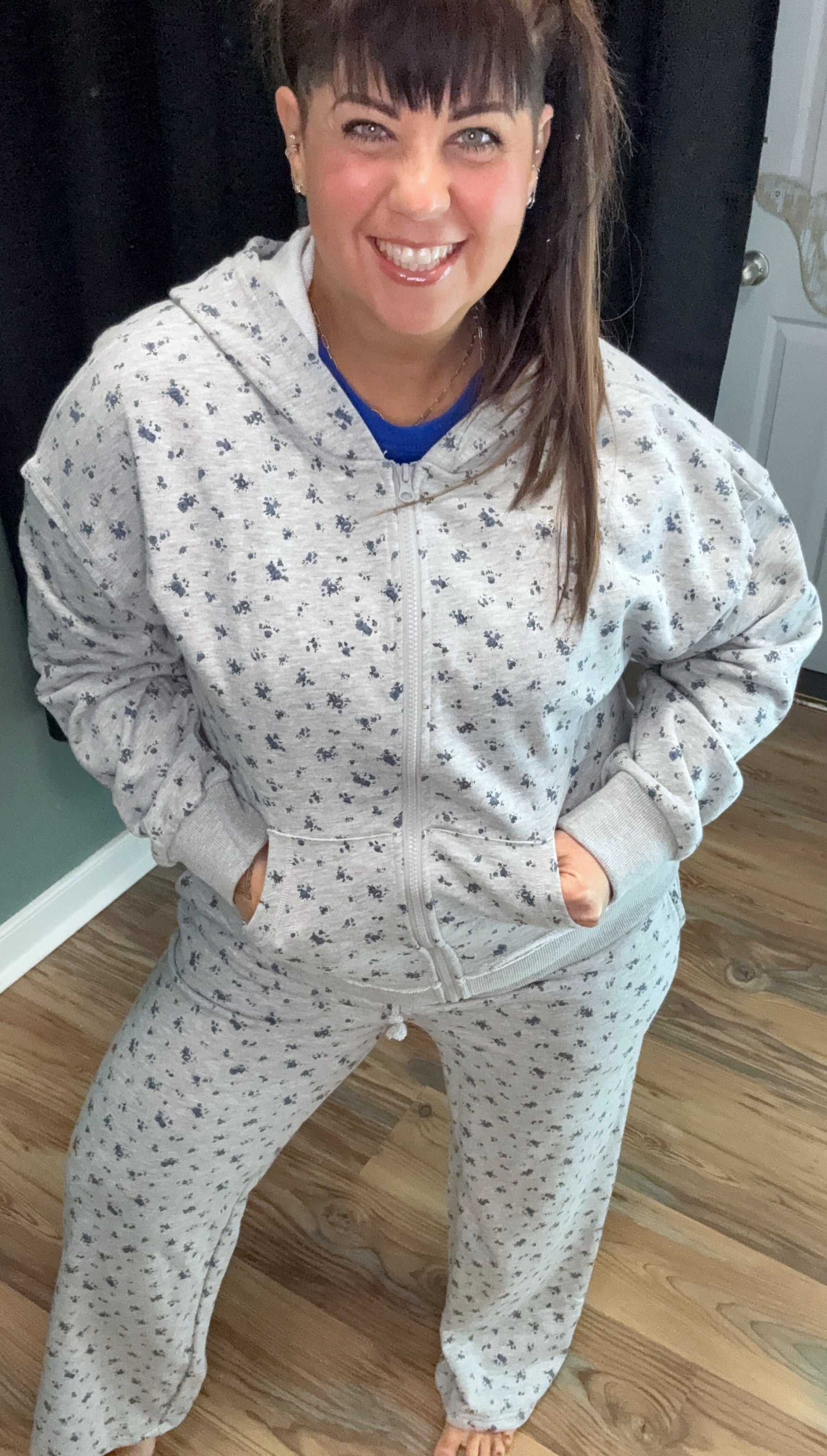 Meet The Oversized Grey Florette Zip Up Hoodie, Your New Cozy Companion! This Snuggly Delight Boasts Stylish Blue Florette Detailing (Because Who Says Hoodies Can't Have Flair?). Perfect For Couch Potato Days Or Strutting Your Stuff, You'll Be So Comfy, You Might Just Forget You're Wearing Pants!