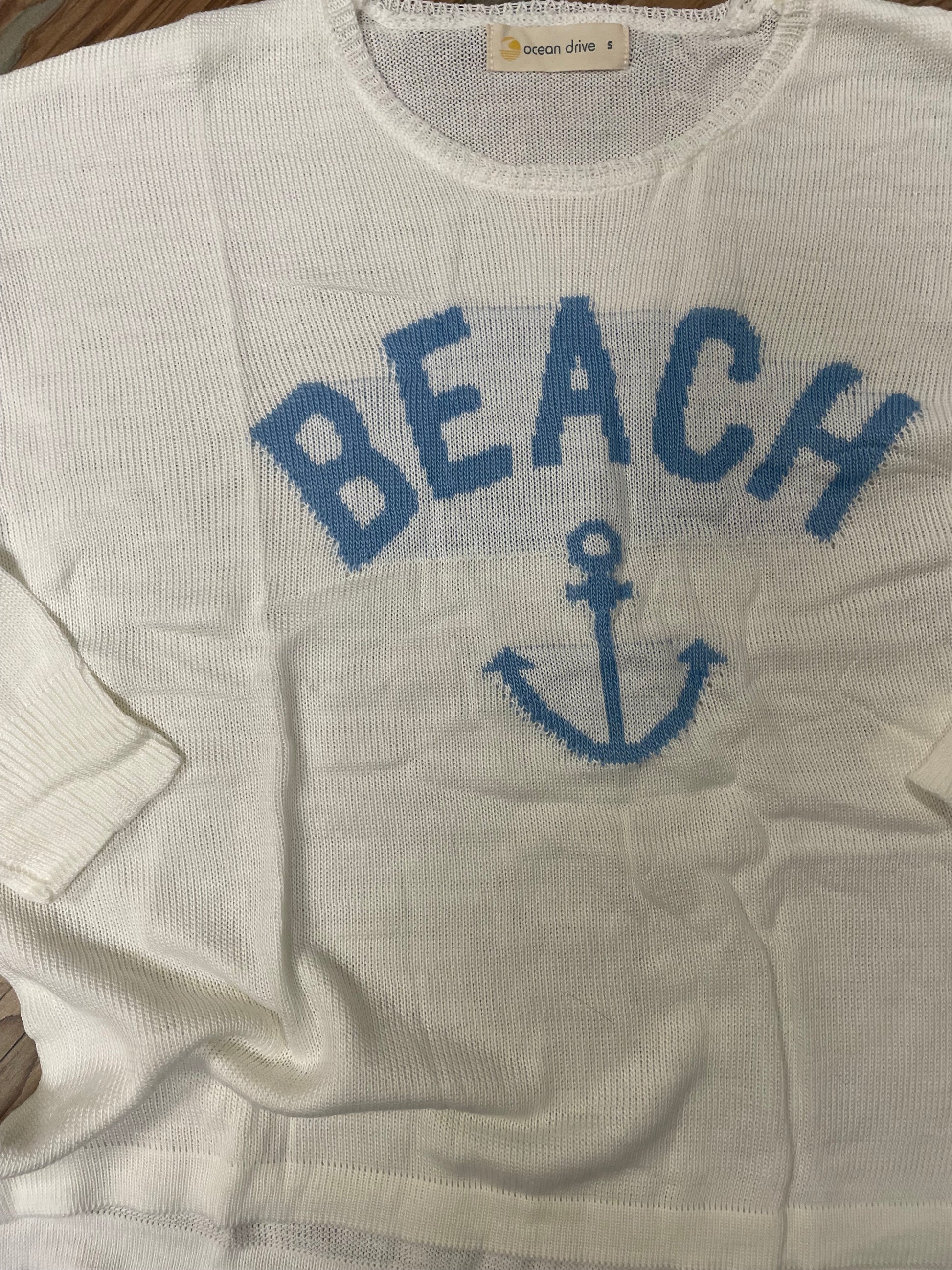 This White Long Sleeve Knit Features A Stylish Blue “Beach” And Anchor Detail Perfect For Casual Outings. With The Petite Side Slits, You’ll Stay Comfortable And Chic As You Embrace The Coastal Vibe With This Versatile Piece That Effortlessly Complements Your Wardrobe.